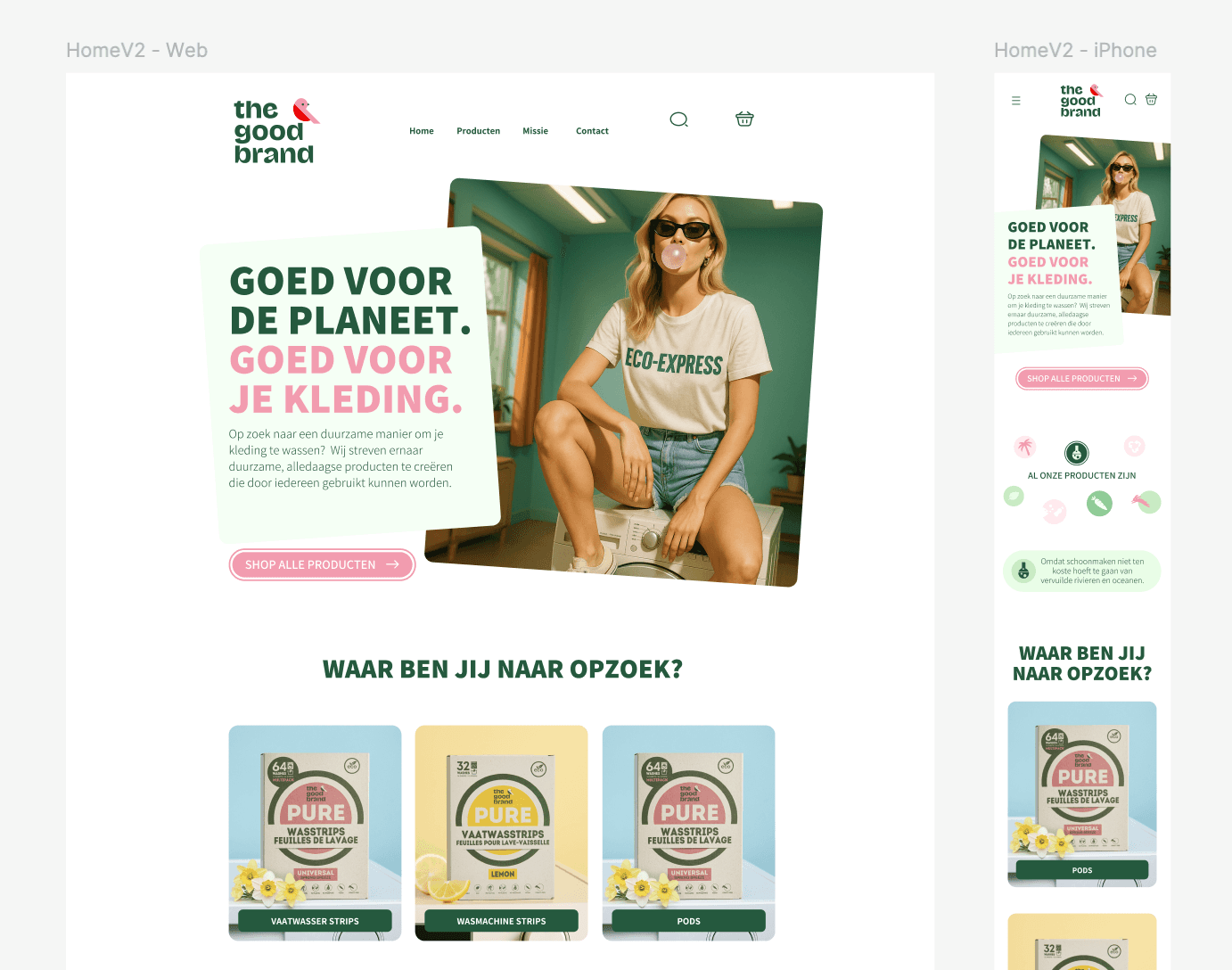 Voor The Good Brand was er een overgang gepland naar Shopify. Ze wilden een moderne, converterende webshop die voor meer omzet moet zorgen. Naast de technische upgrade hebben we ook het merk opgefrist: logo opgepoetst en gekozen voor modernere, sprekendere beeldtaal.